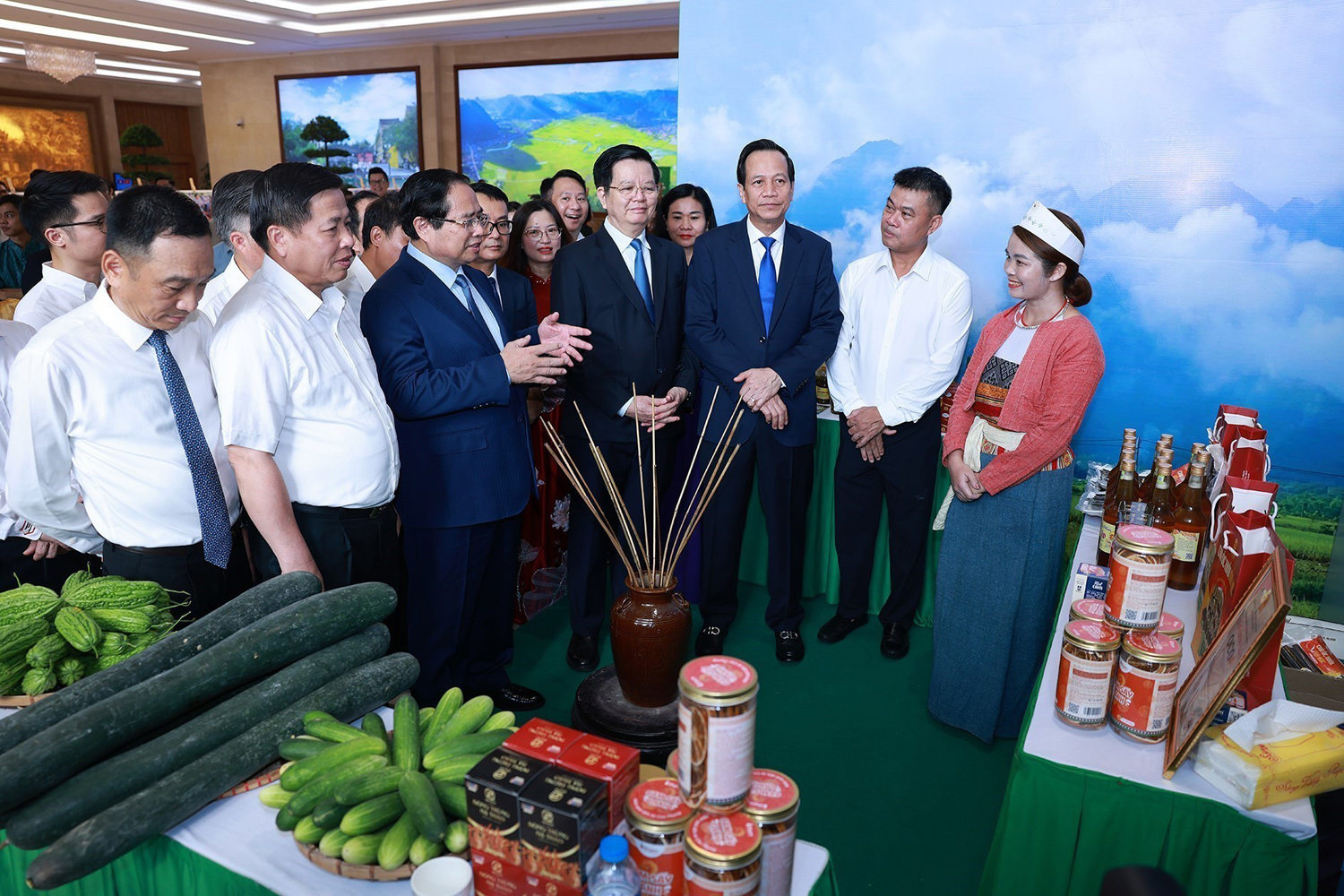 ທ່ານ ຝ້າມ ມິງ ຈິ໊ງ ກຳມະການກົມການເມືອງ ແລະ ນາຍົກລັດຖະມົນຕີ ຢ້ຽມຊົມງານວາງສະແດງຜະລິດຕະພັນ OCOP ຂອງເຂດຊົນເຜົ່າສ່ວນນ້ອຍ ທີ່ກອງປະຊຸມແຫ່ງຊາດສະຫຼຸບໂຄງການເປົ້າໝາຍແຫ່ງຊາດໃນການພັດທະນາເສດຖະກິດ-ສັງຄົມ ເຂດຊົນເຜົ່າສ່ວນນ້ອຍແລະເຂດພູດອຍ. _ພາບ: TTXVN
